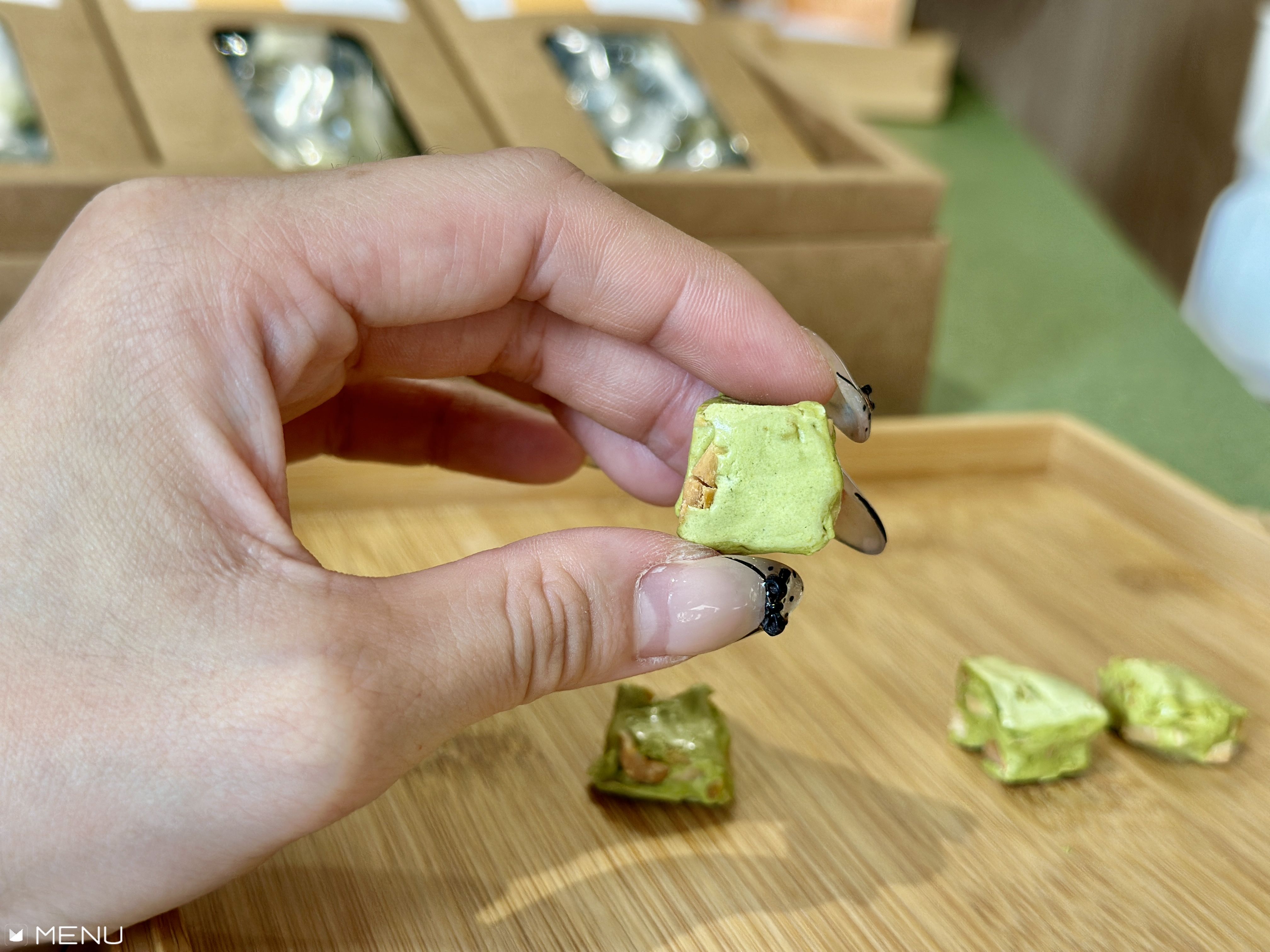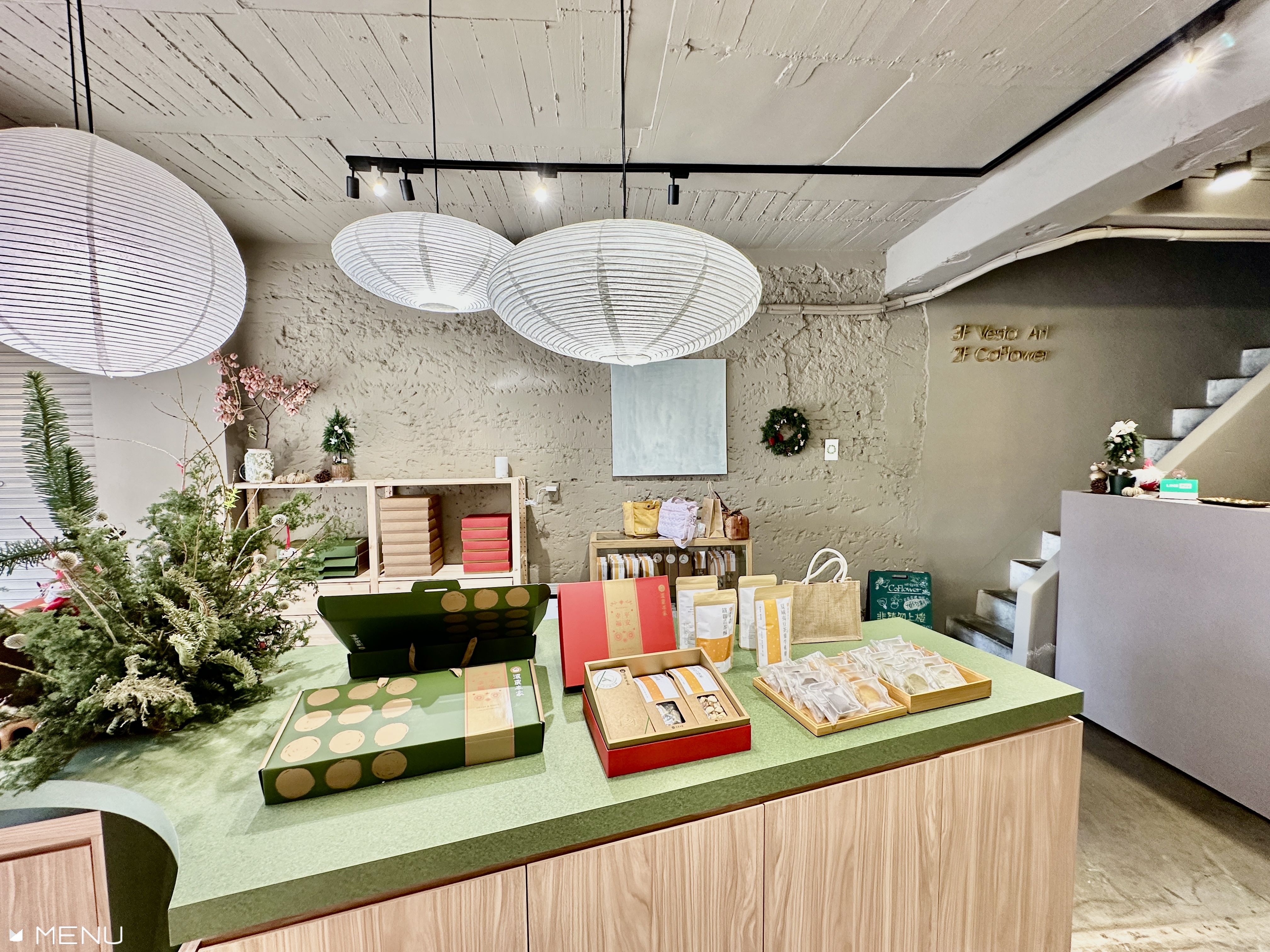店內走鐵觀音深咖啡色,一走進去,整個空間立刻變得好舒服、好安靜,就像找到了一個能放鬆心情的小天地。店中央那個綠色島型展示台超可愛,設計得像小山丘一樣彎彎曲曲的,你在裡面走動的時候,感覺就像在逛一個小小的戶外花園,挑選點心都變得很有趣!頭上吊著的紙燈,柔柔亮亮的,像一片片雲朵,讓整個環境看起來超夢幻。